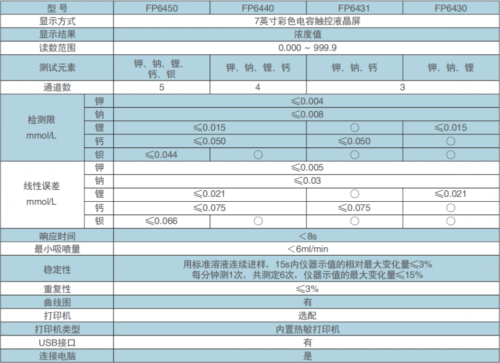 顯示方式:雙通道LCD液晶顯示讀數(shù);測量元素鍵盤可自由選擇;測量元素:鉀、鈉、鋰;曲線標(biāo)定:拆線法、直線法;測量范圍:量程調(diào)節(jié):K:0-15μg/ml 、0-40μg/ml、0-60μg/ml /、0-100μg/ml;Na:0-40μg/ml、0-80μg/ml、0-120μg/ml /、0-160μg/ml ;LI:0-100μg/ml |